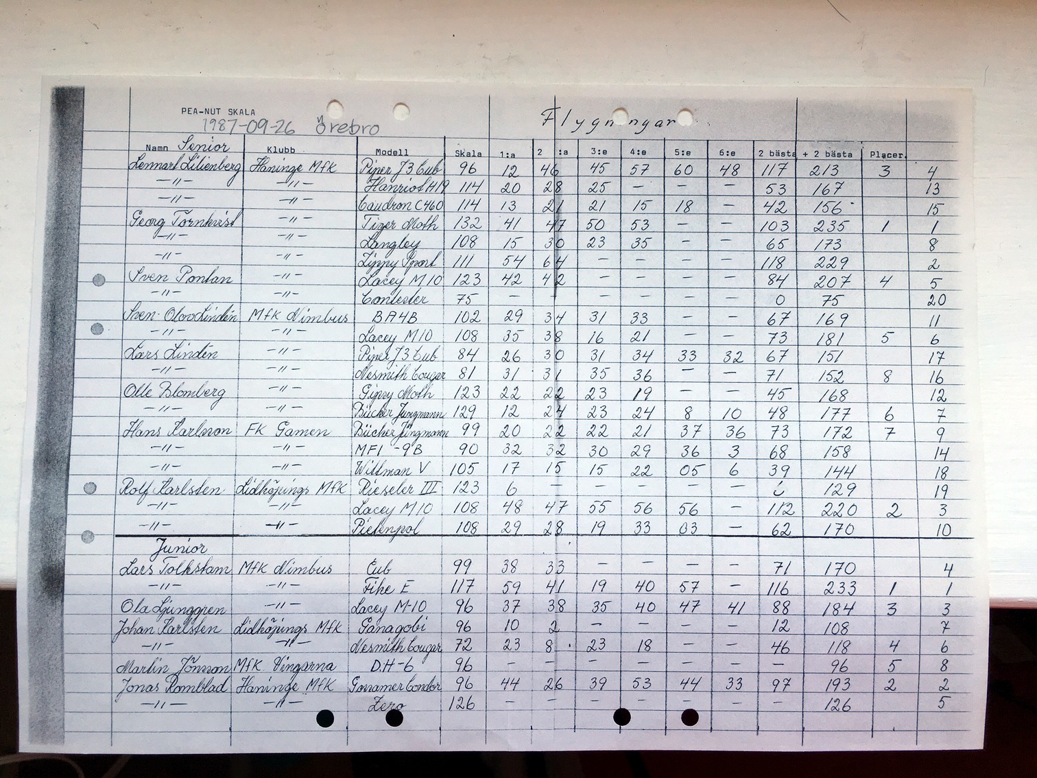 The Swedish Indoor Championships 1993 was held on the 26th September in Örebro. Only two classes were flown, microfilm (F1D) and peanut. Sven Pontan won F1D with best durations around 16 minutes. The winner in peanut was Georg Törnkvist with a Tiger Moth. The junior peanut flyers were scored seperately, though the winner Lars Tolkstam would have placed second in the senior class with his Fike E.